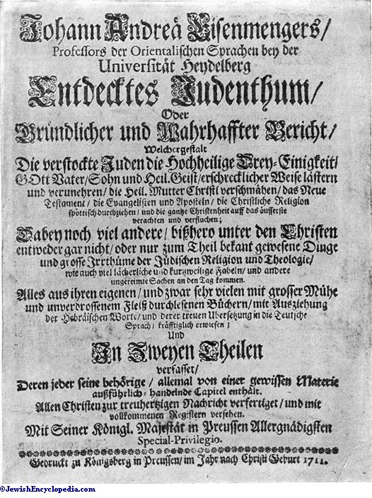L’orientalista tedesco Johann Andreas Eisenmenger scrive il suo Entdecktes Judenthum (“Giudaismo smascherato”). Quest’opera svolgerà un ruolo importante nella formazione di generazioni di antisemiti tedeschi. Tra le accuse mosse agli ebrei, l’omicidio rituale e l’avvelenamento dei cristiani da parte dei medici ebrei.