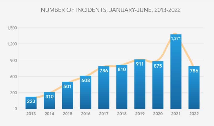 CST’s Antisemitic Incidents Report January-June 2022, published today, shows 786 anti-Jewish hate incidents recorded nationwide in the first half of this year. This is a 43% decrease from the 1,371 incidents recorded in the first six months of 2021, and the joint-fifth-highest total ever reported to CST between January and June in any year. CST recorded 875 antisemitic incidents in the first half of 2020, 911 in the first six months of 2019, and 810 from January to June 2018.