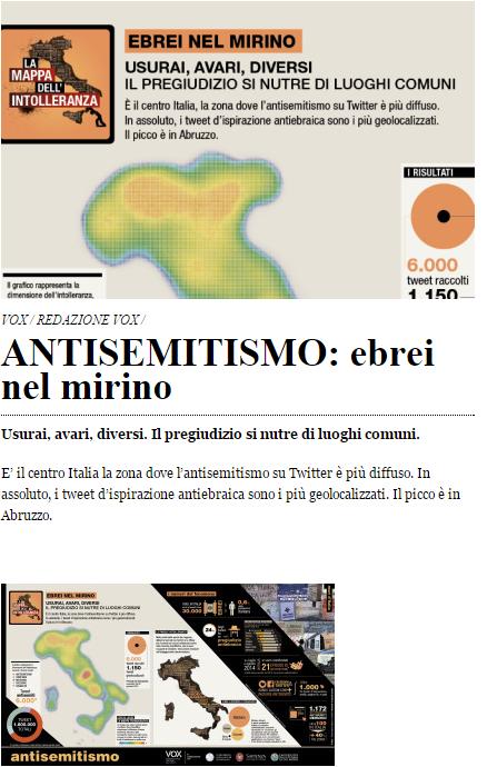 Più di un anno di lavoro, otto mesi di monitoraggio della rete Twitter, quasi 2 milioni di tweet estratti e studiati. Il risultato è la prima Mappa dell’Intolleranza in Italia: un progetto che, voluto da Vox- Osservatorio italiano sui diritti (organizzazione no profit che si occupa di cultura del diritto), ha visto la partecipazione delle università di Milano, Roma e Bari. Il progetto mira a identificare le zone dove l’intolleranza è maggiormente diffusa – secondo 5 gruppi: donne, omosessuali, immigrati, diversamente abili, ebrei – cercando di rilevare il sentimento che anima le communities online, ritenute significative per la garanzia di anonimato che spesso offrono (e quindi per la maggiore “libertà di espressione”) e per l’interattività che garantiscono.