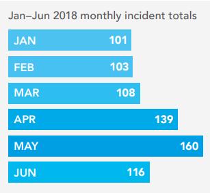 Ogni mese nella prima metà del 2018 ha registrato più di 100 atti di antisemitismo, maggio ha raggiunto il picco con 160 episodi, il quarto totale mensile mai registrato.