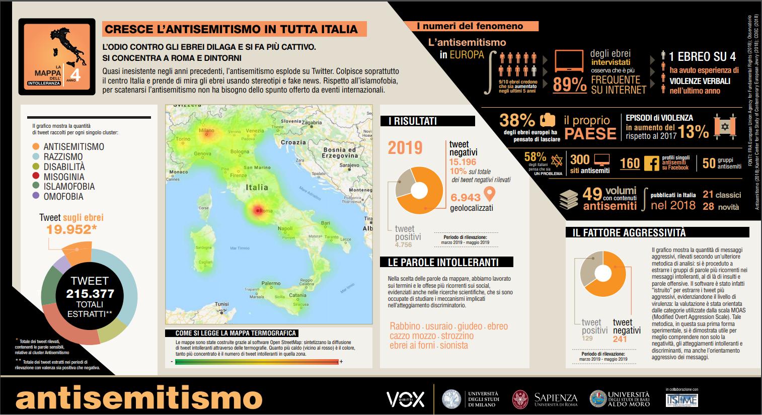 Esce la quarta edizione della Mappa dell’Intolleranza, il progetto ideato da Vox – Osservatorio Italiano sui diritti, in collaborazione con l’Università Statale di Milano, l’Università di Bari, La Sapienza di Roma e il Dipartimento di sociologia dell’Università Cattolica di Milano.