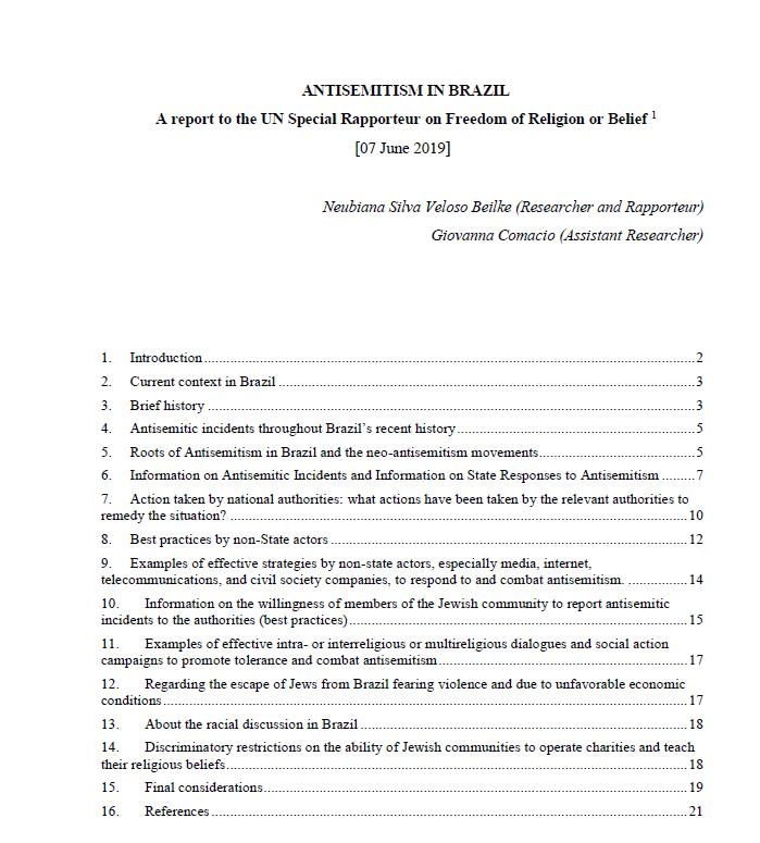 The purpose of this document is to report facts as well as general and specific aspects related to antisemitism in Brazil, focusing on current incidents, and to cover the main issues requested in the invitation to provide input made by Dr. Ahmed Shaheed, for submission to the United Nations (UN). This report has an academic nature and contextualizes the problem related to antisemitism in Brazil, presents information on antisemitic incidents and on laws and policies involving the topic, the State’s responses to antisemitism arising at the national level, and the best practices of non-state actors in addressing the problem, such as: Non-Governmental Organizations (NGOs), Jewish associations and Israeli confederations in Brazil. Such institutions shall act in favor of the dissemination of educational and enlightening information on Jewish culture to prevent discrimination, to counter antisemitic behaviors and the dissemination of a ‘culture of hatred’.