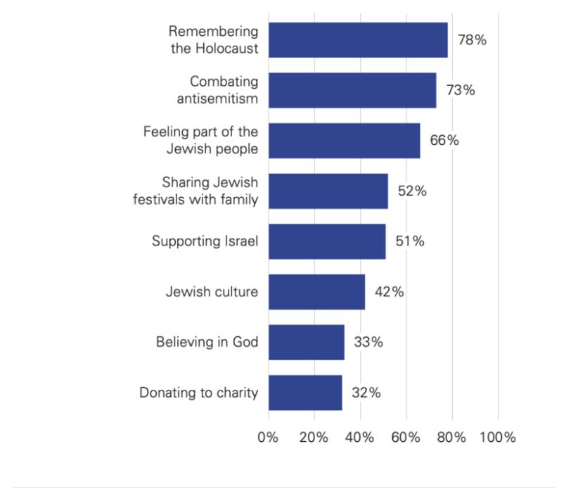 Fin qui dunque si è parlato di differenze che si intrecciano. Però ci sono due elementi che fanno da denominatore comune tra i diversi gruppi. “La Memoria della Shoah e la paura dell’antisemitismo, che risuonano con forza tra tutte le realtà”. Secondo lo studio, infatti, il ricordo della Shoah (78 per cento) e la lotta contro l’antisemitismo (73 per cento) sono i temi in testa a quelli indicati come particolarmente importanti per l’identità ebraico-europea. Sostenere Israele e celebrare le feste ebraiche è invece molto importante per circa il 50 per cento degli intervistati. Circa un terzo ha detto che la fede in Dio è molto importante.