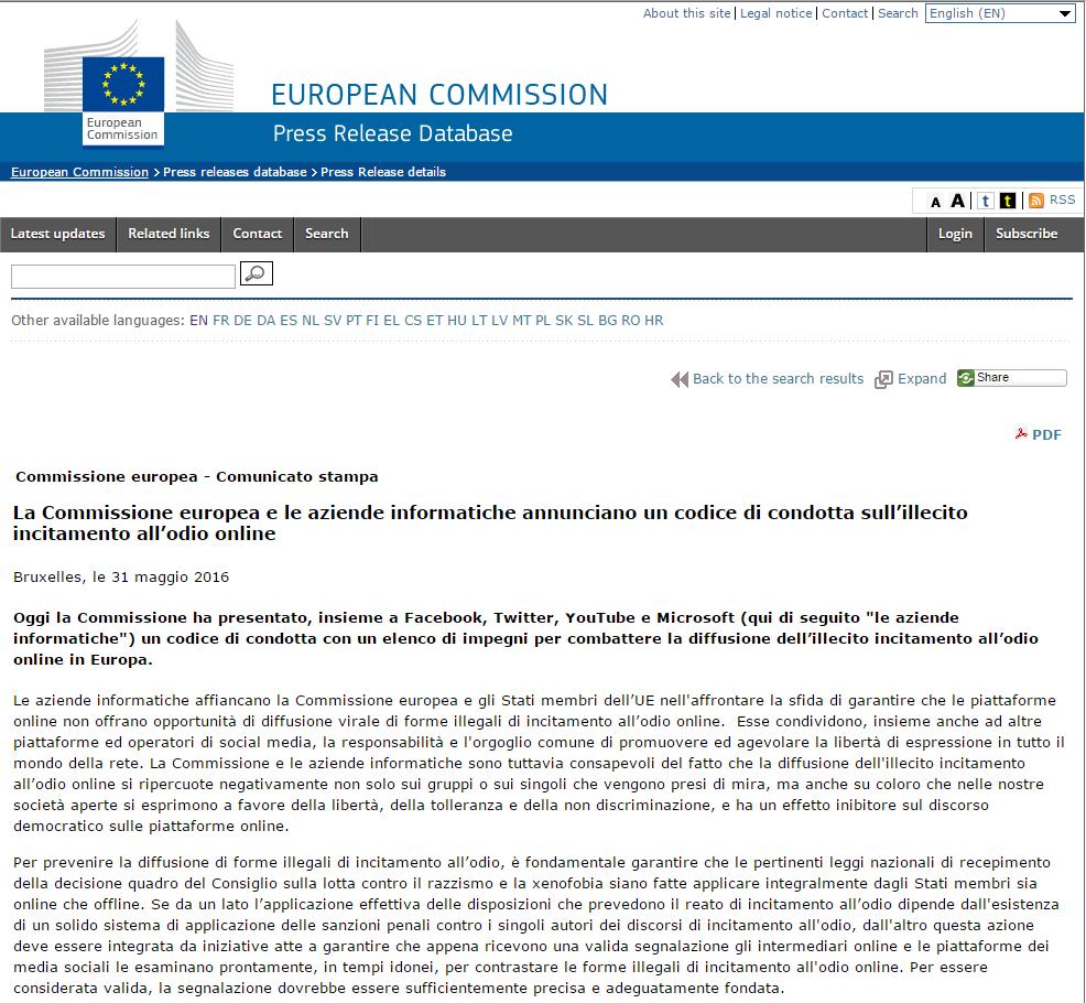 «I social media sono purtroppo uno degli strumenti che i terroristi usano per radicalizzare i giovani e diffondere la violenza» ha dichiarato Vera Jourová, la Commissaria europea per la Giustizia. Ma le preoccupazioni per il cosiddetto hate speech non riguardano solo il terrorismo: il codice si basa su una legge europea del 2008 che «definisce reato tutti i comportamenti che incitano pubblicamente alla violenza o all’odio direttamente contro gruppi di persone o persone con riferimento a razza, colore, religione, provenienza, nazionalità o origine etnica». E fa eco alle preoccupazioni di tanti politici anche in Italia, in testa la presidente della Camera Laura Boldrini, che su questo tema ha intrapreso una battaglia in prima persona. In un tweet la replica di Jillian York, attivista della Electronic Frontiers Foundation, non si è fatta attendere: «Le società ottengono così ancora più il controllo sulla nostra parola». Le fanno eco gli attivisti europei di EDRi e quelli americani di Access Now.
