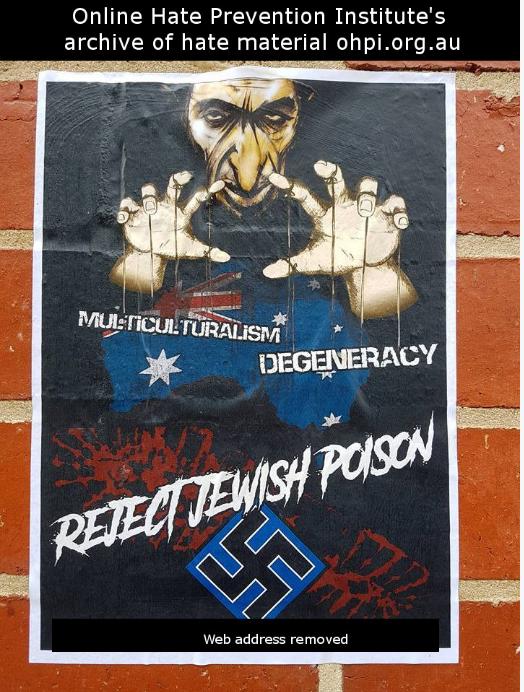 The second poster has a picture has the message “reject Jewish poison”. It has a picture of a man representing an Jew, the same picture used in other antisemitic material, pulling strings attached to the words “multiculturalism” and “degeneracy” which he is hovering over a map of Australia coloured to look like an Australian flag.