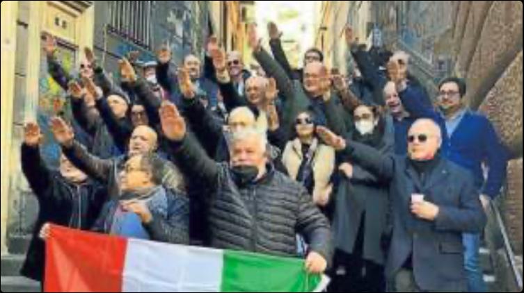 Sorrisi e saluto fascista: a farlo dirigenti nazionali di Fdi, candidati alle ultime elezioni e militanti del partito a Napoli. Tutti in posa con il braccio teso, a pochi passi dalla centralissima via Toledo. Sono una trentina: tra loro a sfoderare il saluto romano il componente della Direzione nazionale di Fdi e candidato alle ultime elezioni comunali, Luigi Rispoli e il giovane Alfredo Catapano, anche lui in corsa per il Consiglio comunale con Fdi. Nella fotografia spunta pure Pietro Diodato, ex consigliere regionale, protagonista della lite a testate con il consigliere Marco Nonno ed espulso dal partito per essersi poi candidato nella civica di Maresca, a poche ore dalla consegna delle liste per le comunali. Ieri l’appuntamento alle 12 a piazzetta Augusteo per celebrare il 40esimo anniversario del Movimento sociale italiano con tanto di brindisi ai tavoli di uno dei bar della piazzetta. Poi tutti in posa per la foto ricordo scattata sui gradini Conte Di Mola, accanto alla funicolare centrale. Sistemati dietro una bandiera italiana sorridenti e convinti fanno il saluto fascista. Chissà cosa ne penserà la loro leader Giorgia Meloni che proprio di recente ha dichiarato «Nel dna di Fratelli d’Italia non ci sono nostalgie fasciste, razziste e antisemite. Non c’è posto per nulla di tutto questo». A quanto pare per i dirigenti, candidati alle elezioni e militanti del suo partito a Napoli invece di posto per tutto questo ce n’è.