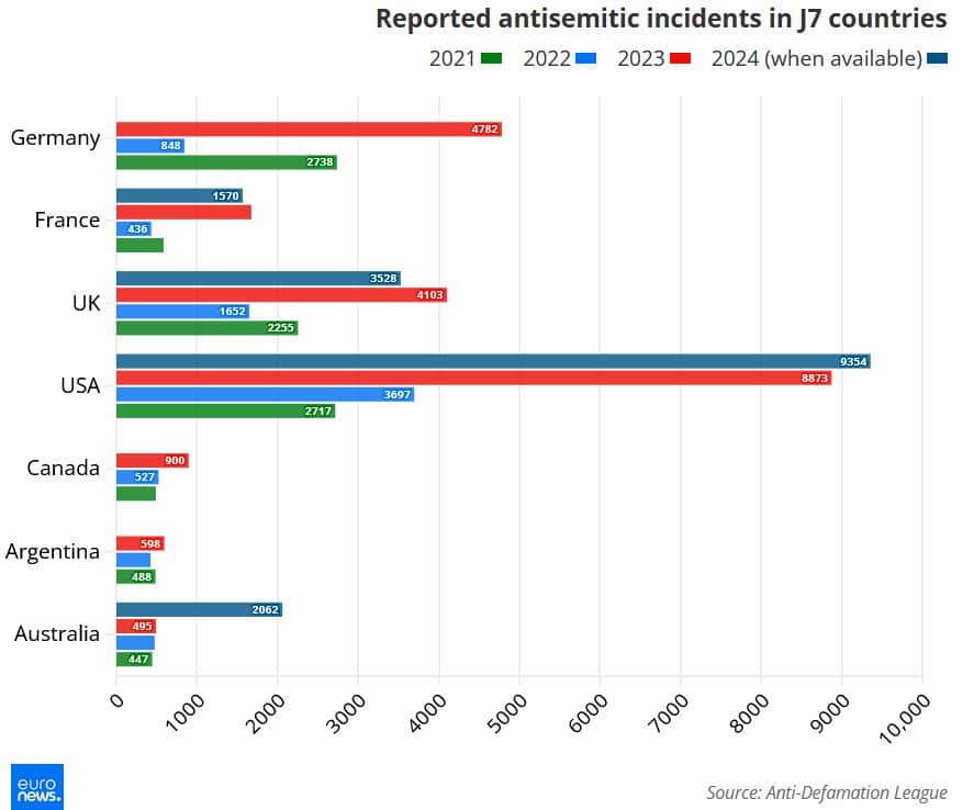 Si tratta dei cosiddetti Paesi del J7 – Germania, Francia, Regno Unito, Canada, Stati Uniti, Australia e Argentina – dove, secondo l’Adl, gli attacchi contro ebrei, sinagoghe, scuole e attività commerciali si sono intensificati in maniera allarmante nel 2023.
