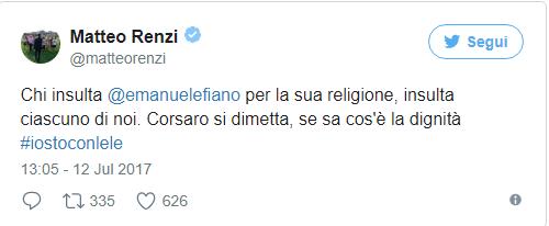 Sulla vicenda è intervenuto anche il segretario del Pd, Matteo Renzi, che ha chiesto le dimissioni di Corsaro. «Il deputato della destra di cui mi vergogno a fare il nome dovrebbe ricordare che il padre di Lele Fiano è uno dei pochi sopravvissuti ad Auschwitz dove ha perso la mamma, il papà, il fratello la cognata e il nipotino – ha detto Renzi – Di fronte a questo non ci sono scherzi che tengono, se Corsaro avesse un minimo di dignità si dimetterebbe anche stasera». «A qualcuno si è spenta l’aria condizionata. Ognuno può pensarla come vuole sul provvedimento ma i 5 stelle hanno detto è liberticida: liberticida era il fascismo», ha aggiunto. In tanti, anche tra gli avversari politici, hanno espresso solidarietà a Fiano.