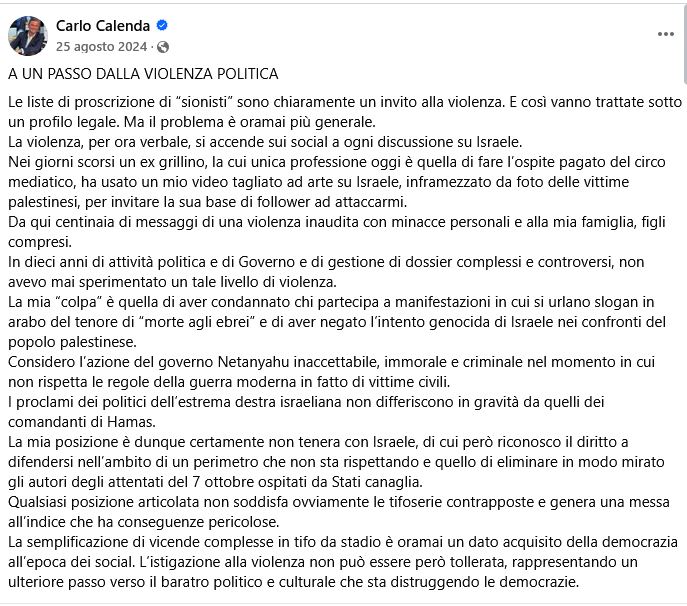 Utente invia un messagio al Deputato Carlo Calenda chiamandolo “servo del genocidio”  e augurando “che i tuoi figli [Calenda] facciano la fine dei bambini palestinesi”.