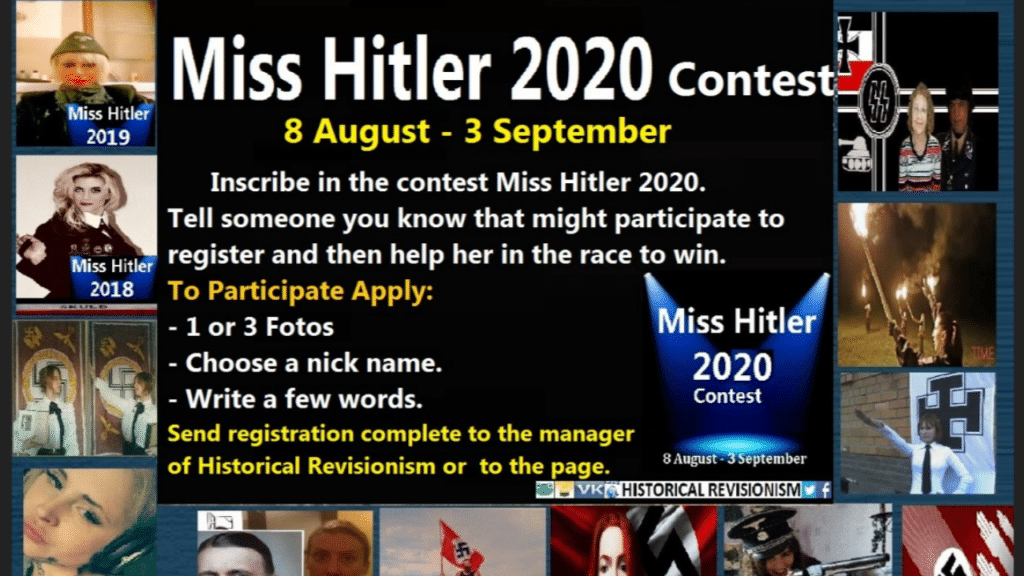 Negli ultimi due anni, gruppi di neo-nazisti sul Web hanno tentato di svolgere tale “gara hitleriana” in varie piattaforme, eludendo i controlli. Dopo molte pressioni da parte dello Stato di Israele, il social network russo VKontakte – meglio conosciuto come VK – ha deciso di eliminare la pagina dedicata a Miss Hitler 2020. Questo fenomeno continua da molti anni, nel 2014 Mosaico pubblicò un articolo in merito.