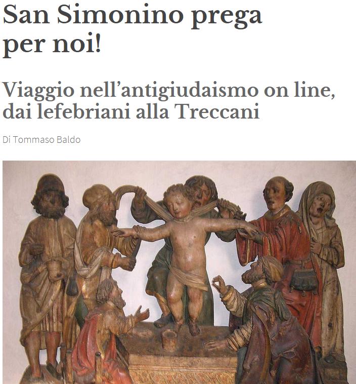 Come persona che si occupa di didattica della storia, Baldo si dichiara «stupito per l’esistenza ancora oggi tanto radicata di un pericoloso antisemitismo — aggiunge — I negazionisti vanno sconfitti con il lavoro di insegnanti e operatori museali perché dietro a una patina di razionalità a volte si nascondono abissi di follia». Oggi, nel giorno della memoria, fa riflettere un’inchiesta firmata dallo stesso Baldo. Nel blog da lui ideato, attorno alla vicenda del Simonino propone un accurato Viaggio nell’antigiudaismo on line, dai lefebriani alla Treccani. «È possibile che sul web antichi fantasmi tornino a nuova vita? — si interroga — È possibile che si diffonda ancora in modo massiccio la più incredibile delle calunnie rivolte contro gli ebrei: l’accusa del sangue, cioè l’accusa di aver ucciso e dissanguato bambini cristiani nel corso di crudeli rituali legati alla pasqua ebraica? Questa calunnia pare sia stata recentemente ripresa da un quotidiano vicino ad Hamas (almeno stando a quanto afferma l’israeliano The Jerusalem Post), ma la sua origine non è mussulmana bensì cristiana — specifica — C’è ancora qualcuno qui in Europa che presta fede a questa accusa? Mi pongo questa domanda da un punto di osserva-zione privilegiato da Trento, dove sino al 1965 era assai diffuso il culto di San Simonino». Citando fonti quali Iginio Rogger, Ariel Toaff, Franco Cardini, Carlo Ginzburg, Adriano Prosperi, Diego Quaglioni, Baldo ricostruisce un quadro composito, mettendo a disposizione un rigoroso metodo di analisi.