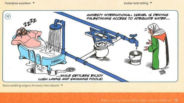 Il capitolo in cui la caricatura è apparsa affrontava la presunta disuguaglianza nella distribuzione dell’acqua tra israeliani e palestinesi residenti in Cisgiordania. La caricatura mostra un ebreo in sovrappeso, con i peot, addormentato in una vasca piena d’acqua, che contrasta con una vecchia donna palestinese in piedi, accanto a un secchio d’acqua vuoto.