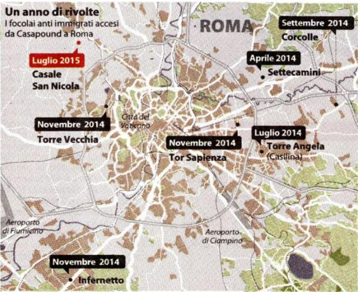 ROMA. Non c’è nulla di spontaneo nel giorno da cani di Casale san Nicola, né nella carne da cannone offerta alle cariche della Celere a beneficio di telecamere («Semo italiani come voi!», «Anche tu c’hai ‘na moje e’na famija! »). Perché non è la prima rappresentazione. E perché non sarà l’ultima. Perché le sue stimmate — la tartaruga nera e i caschi integrali di CasaPound — i suoi volti (Simone Di Stefano, che di Casa Pound è vicepresidente, come il suo spicciafaccende Mauro Antonini ) e soprattutto il canovaccio e la messa in scena delle sue parole d’ordine — «Gli Italiani per primi. (variante dell’originale ‘ Padroni a casa nostra’ ), sono il format di una Fabbrica dell’Odio battezzata esattamente un anno fa — sabato 14 luglio 2014 — nel corteo che attraversò il quartiere Esquilino, a Roma ( dove CasaPound ha la sua sede) e che fu Epifania dell’abbraccio tra i fascisti di Gianluca Iannone e la Lega Nord della coppia Borghezio-Salvini. Dodici mesi fa, una marcia per un generico “cartello’ «contro gli immigrati». Dal febbraio scorso, patto politico organico all’ombra delle tre spighe (“No euro” , “stop immigrati”, “Prima gli Italiani”), simbolo della neonata sigla “Sovranità”, creatura che di Salvini è stampella e di Casa Pound succursale. Luglio 2014, luglio 2015. I piccoli e grandi fuochi di cui si è accesa Roma in questi dodici mesi hanno la cadenza, le modalità e i luoghi propri di una pianificazione certosina. Dove le borgate dell’aerea metropolitana, sollecitate e accompagnate alla ‘rivolta” contro i centri di accoglienza per immigrati, non sono semplicemente luoghi da liberare dai ‘Negri‘ e restituire agli ‘Italiani‘, ma la mappa di un Risiko della paura dagli immediati dividendi politici ( e non solo, come vedremo). Una leva. Un pretesto. Una pentola a pressione sotto la quale non deve mai essere spento il fuoco. In principio, fu la “rivolta di Settecamini”. Poi toccò a Torre Angela, Ponte di Nona, Corcolle, Tor Sapienza, Infernetto, Tor Pignattara. In una sequenza che, ogni volta, si ripropone identica a sé stessa. Sulla scena — proprio come ieri a Casale san Nicola — si muovono “Comitati di quartiere” di cui CasaPound è il ventriloquo. Spuntano come funghi e, negli ultimi sei mesi dei 2014, si arriva a contarne 60. Invariabilmente professano di non essere «né di destra, né di sinistra». Di fatto, non ce ne è uno che non abbia come suo capo bastone qualche vecchio arnese della fascisteria romana, piuttosto che militanti di Forza Nuova. E, altrettanto invariabilmente, «l’incidente» che ne innesca la rivolta è regolarmente opaco nelle dinamiche ( le aggressioni a Tor Sapienza, piuttosto che gli asseriti assalti agli autobus a Corcolle, i “raid Rom” di Torre Vecchia) e certamente sproporzionato rispetto alla reazione. Una qualificata fonte investigativa del Ros dei carabinieri — dove ormai, dopo cinque anni di indagini, esiste un’enciclopedia su CasaPound — spiega: «La regia nella cosiddetta rivolta delle borgate contro i centri di assistenza agli immigrati ha un tratto evidente. Cercare l’incidente. Se necessario, provocarlo, certamente ingigantirne la portata. La logica è quella di mantenere costante la tensione e sfruttare la potenzialità manipolatorie dello strumento mediatico». C’è di più. Nelle retrovie della campagna di odio di CasaPound e di Salvini, protetti dalla maschera posticcia dei “Comitati di quartiere” e la loro «lotta agli immigrati», si muovono, almeno fino a quando sono stati in grado di farlo, tre figure chiave della destra “politica” romana che dicono molto del doppio fondo della “rivolta”. Gianni Alemanno, Luca Gramazio, Giordano Tredicine ( per dirne una, partecipano nel novembre scorso alla “marcia delle Periferie sul Campidoglio” ). Colpiti tutti e tre dall’inchiesta “Mafia Capitale”, lavorano — per quanto ha sin qui documentato la Procura di Roma — per l’associazione mafiosa di Salvatore Buzzi e Massimo Carminati il cui core business, guarda un po’, è proprio l’accoglienza dei migranti. In piazza, crocefiggono la nuova giunta Marino per le politiche e i costi dell’accoglienza e soffiano sulla rivolta identitaria che, di fatto, costringe il governo e il prefetto della città a un’affannosa e costosissima rincorsa a nuove sistemazioni per i migranti. In privato, si fanno strumento del cartello (La 29 giugno di Buzzi e la Cascina ) che ha il monopolio della gestione dei centri di accoglienza e dunque tratta in posizione di forza tariffe e quote. Chiosa uno degli investigatori dell’inchiesta “Mafia Capitale”: «Diciamo che se la città comincia a bruciare di rivolte contro gli immigrati, chi dà le carte nel mercato dell’accoglienza è in posizione di forza. Perché offre una soluzione a un’emergenza. Diciamo che il problema è dunque chi ha creato artificialmente quell’emergenza e cosa vuole davvero. Solo Roma ai romani?».