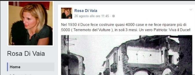 IL MESSAGGIO, postato su Facebook venerdì scorso e tolto qualche ora dopo, recitava testualmente: «Nel 1930 il Duce fece costruire quasi 4.000 case e ne fece riparare più di 5.000 (terremoto del Vulture), in soli 3 mesi. Un vero Patriota! Viva il Duce!». Nel dibattito post-terremoto in Centro Italia, l’assessore alla Cultura del Municipio 5 Rosa Di Vaia (Forza Italia) ha scritto un messaggio che inneggiava al capo del fascismo. Un post che ha scatenato le immediate reazioni del centrosinistra milanese. Il primo a chiedere le dimissioni della Di Vaia è stato il deputato del Pd Emanuele Fiano: «Mi domando quante ore dovremo aspettare ancora prima che il presidente di quel Municipio restituisca la sig.ra Rosa Di Vaia alla sua precedente occupazione». Poche ore dopo sono stati due assessori comunali, Pierfrancesco Majorino e Filippo Del Corno, a chiedere la revoca dell’incarico.
