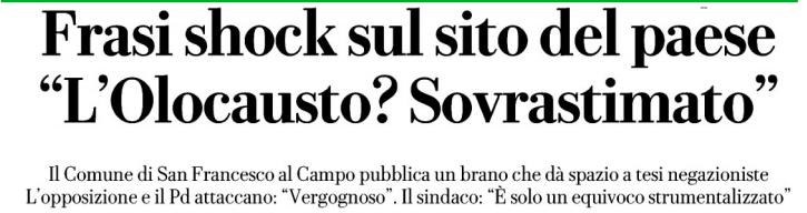 Il Comune di San Francesco al Campo pubblica un brano che dà spazio a tesi negazioniste L’opposizione e il Pd attaccano: “Vergognoso”. Il sindaco: “È solo un equivoco strumentalizzato”