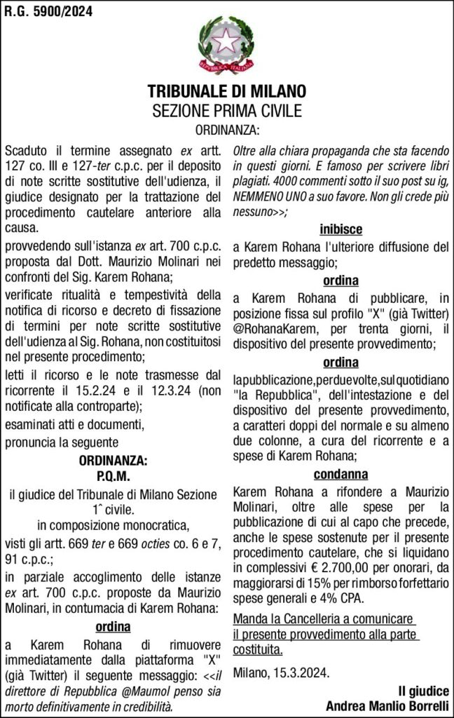 Apprendiamo con gioia che, almeno in questo caso, giustizia è fatta. Un uomo, di nome Karem Rohana, attivista italo-palestinese, carico di livore, ha accusato su Twitter (ora X) il direttore de La Repubblica, Maurizio Molinari, di plagio e di essere “morto in credibilità” per “la propaganda che sta facendo” a Israele. Classici argomenti anti-sionisti, ma stavolta c’erano i margini per una querela. E Rohana ha perso la causa, ora deve risarcire Molinari per il danno arrecato, oltre a dover cancellare il suo post. Lo stesso attivista palestinese, che di professione fa il logopedista, non è nuovo a questo tipo di molestie. È stato infatti denunciato anche dal sindaco di Firenze, Dario Nardella, per stalking. E da questa denuncia è scaturito un ammonimento da parte del questore. Si tratta a tutti gli effetti di un ammonimento della pubblica autorità che diffida il soggetto ad avvicinare il suo “bersaglio“.La sentenza a favore di Molinari, comunque, è una buona notizia per tutti coloro che si esprimono liberamente in difesa di Israele e, in questo periodo, vengono attaccati, online e dal vivo, sempre più duramente e sempre più intensamente. È una sentenza, finalmente, da paese democratico.