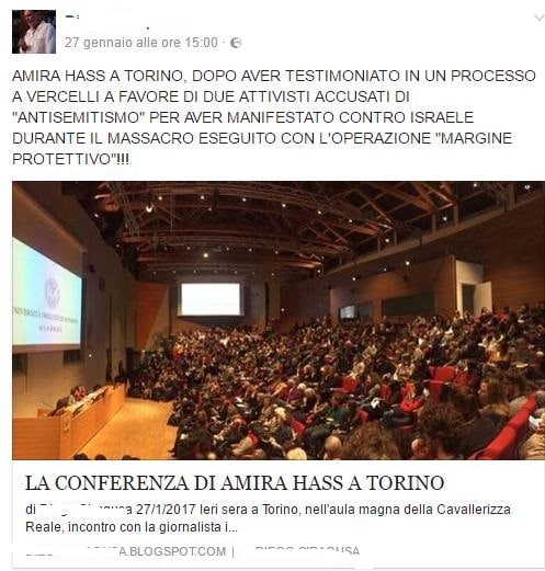 Nulla contro Amira Hass, giornalista e scrittrice israeliana, l’unica inviata dai territori occupati. Nulla nemmeno contro il tema della serata nell’ aula magna dell’Università nella Cavallerizza Reale: “Israele e i palestinesi nell’era di Trump”. Evento organizzato dal dipartimento Culture, Politica e Società di Unito giovedì sera. Quello che fa storcere il naso a Filippo Tedeschi, vicepresidente dell’Ugei, Unione Giovani Ebrei d’Italia, è il fatto che la conferenza si sia tenuta alla vigilia del 27 gennaio. Oltre al fatto che abbiano aderito all’evento alcune associazioni come Rete Eco. Non solo. Alla Cavallerizza erano presenti militanti di Bds Italia per il boicottaggio di Israele. «Non capisco perché l’Università faccia queste scelte — dice Tedeschi — associazioni estremamente di parte che sono contro Israele dimenticando il terrorismo di matrice palestinese», ha spiegato dal palco al Palaruffini. La professoressa Rosita Di Peri respinge questa lettura «Rete Eco è una delle tante associazioni che hanno aderito, come Sereno regis, Pax Christi e altre. C’erano degli esponenti di Bds che sono intervenuti, ma la discussione non è degenerata e non ha preso pieghe polemiche». La docente sottolinea che non ha visto volantinare, «attività che non può e non deve essere comunque impedita, come la possibilità di partecipare ad una serata che si è tenuta il 26 di gennaio perché era l’unica data disponibile da parte di Amira Hass».