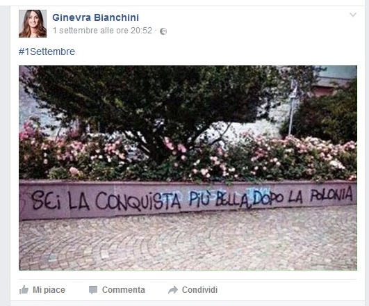 Il capogruppo della Lista Caligiore, Ginevra Bianchini, pubblica un post su facebook e scoppia un caso politico che mette in imbarazzo l’amministrazione “né (di) destra, né (di) sinistra”, come da manifesto elettorale del sindaco. Una leggerezza da social o la volontà di ribadire le sue radici politiche? Certo è che il post, che richiama espressamente l’invasione della Polonia del 1939 da parte dell’esercito nazista e russo, ha scatenato un putiferio sia sul social che tra le forze politiche. «È scandaloso che la consigliera Bianchini, anche in qualità di presidente della consulta femminile dell’Anci, continui a esaltare sui social network il valore della violenza – scrive, tra l’altro, in una nota Sinistra e Libertà –Evidentemente digiuna di storia, dovrebbe sapere che il 1 settembre 1939, con l’invasione della Polonia da parte dei nazisti e dei russi, si è aperta una delle peggiori pagine della storia dell’umanità, che ha portato alla morte di milioni di persone. Se avesse il cuore, la coerenza e il coraggio di ammettere pubblicamente le proprie idee e simpatie, la città di Ceccano e ceccanesi sarebbero in condizione di sapere chi oggi effettivamente sta governano la città». E concludono, dopo averla invitata a dimettersi dalla Presidenza della consulta femminile dell’Anci: «E se non la capisce da sola, intervenga Caligiore, che ha giurato più volte di difendere i valori costituzionali, come l’antifascismo e l’antinazismo, prima come rispettoso servitore dello Stato, qual è, e poi come sindaco».