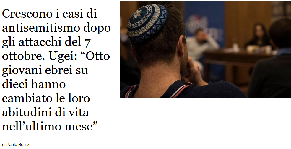 Crescono i casi di antisemitismo dopo gli attacchi del 7 ottobre. Ugei: “Otto giovani ebrei su dieci hanno cambiato le loro abitudini di vita nell’ultimo mese”