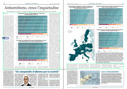 “La sinagoga la si riconosce facilmente, è quella con la camionetta dell’esercito davanti”. Un commento leggero, fatto senza cattive intenzioni, normale, che però purtroppo corrisponde a un’immagine così familiare da essere considerata normale. Quasi rassicurante. Ma non è così, e non sono rassicuranti i dati raccolti dall’ultimo sondaggio sulla percezione dell’antisemitismo commissionato dall’Agenzia Europea per i Diritti Fondamentali (FRA) e affidato all’Institute for Jewish Policy Research (JPR) di Londra in collaborazione con IPSOS. L’85 % dei rispondenti considera antisemitismo e razzismo come i problemi peggiori dei paesi europei dove si è tenuto il sondaggio. L’89 % è convinto che l’antisemitismo nel proprio paese sia aumentato nel corso degli ultimi cinque anni. Il 72 % di chi ha risposto esprime preoccupazione per l’aumento dell’intolleranza nei confronti dei musulmani. L’89 % percepisce l’odio online come un problema grave. La maggior parte dei partecipanti ha dichiarato di essere esposto regolarmente a commenti negativi sugli ebrei, e l’80 % ha identificato internet come il luogo dove avviene più spesso. Come ha commentato Michael O’Flaherty, che della FRA è il direttore: “Non sorprende che la grande maggioranza dei partecipanti al sondaggio ritenga che l’antisemitismo stia peggiorando. Temono per la propria sicurezza e per quella dei loro cari. Si proteggono lasciando la kippà a casa ed evitando certe aree delle loro città, o gli eventi ebraici”. In questo secondo sondaggio sulla percezione dell’antisemitismo, che si è tenuto a maggio e giugno 2018, sono state raccolte le risposte di 16.395 rispondenti residenti in Austria, Belgio, Danimarca, Francia, Germania, Ungheria, Italia, Paesi Bassi, Polonia, Spagna, Svezia e Regno Unito e Lettonia, paesi in cui abita il 96 per cento degli ebrei europei.