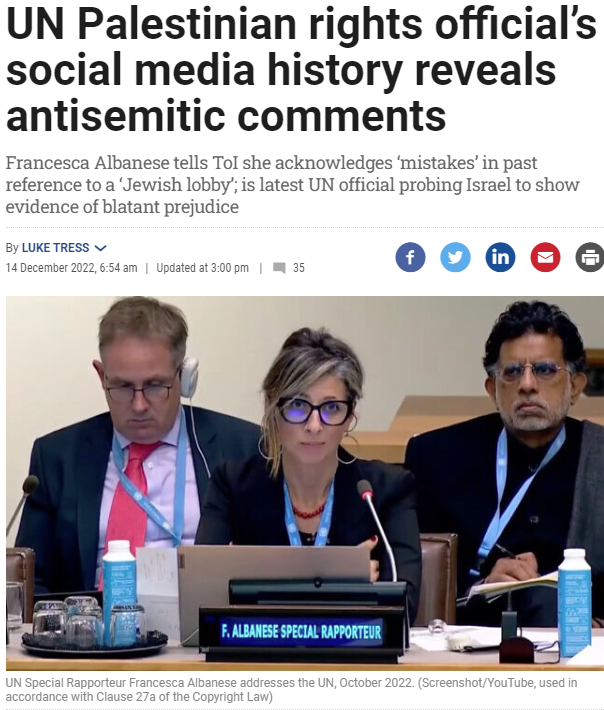 Albanese’s “Jewish lobby” comments echoed recent statements by another UN official investigating Israel.