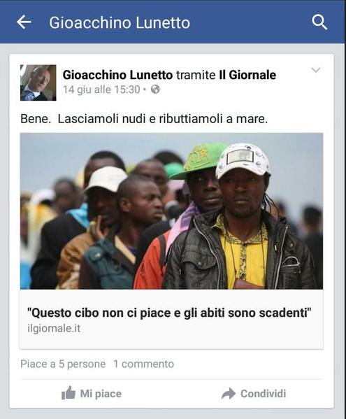 L’imbarazzante fascicolo con lo sproloquio razzista del dirigente della Polfer etnea adesso è all’esame della Procura. Sono stati gli stessi colleghi della Digos a denunciarlo. Il questore Marcello Cardona si limita a dire: «Ho disposto l’avvio, con rapidità e rigore, delle opportune valutazioni per l’adozione di provvedimenti disciplinari». Ma sono almeno dieci mesi che Lunetto, che non ha mai fatto mistero delle sue simpatie fasciste, un’esperienza da consigliere comunale nel piccolo centro di Aci Sant’Antonio, lancia i suoi strali razzisti sulla sua pagina facebook senza che nessuno intervenga. “Bruciarli vivi o rimpatriarli”, è la sua ricetta. “Gli italiani emigrati negli Stati Uniti, in Germania o nelle altre nazioni non hanno mai avuto un comportamento simile” scrive il 28 settembre del 2014 condividendo un link del sito di destra “Sputtaniamoli tutti”.”Diamogli fuoco insieme agli italioti che li indottrinano ed aizzano”.