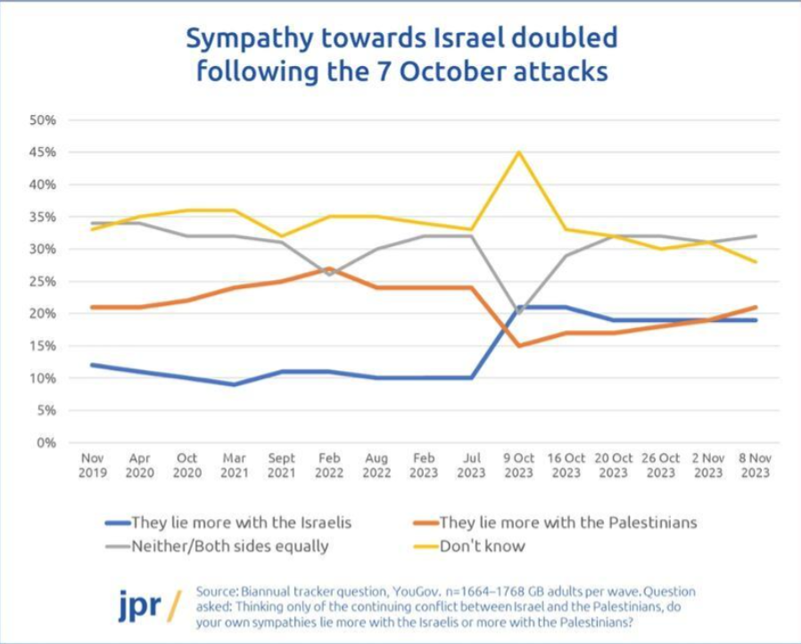 But straight after the October 7 attacks, sympathy for Israel jumped from 10% to 20%, while sympathy for the Palestinians fell from about 25% to 15%. In short, for the first time in years, there was a complete realignment in public opinion, with actually more sympathy for Israel than for the Palestinians.