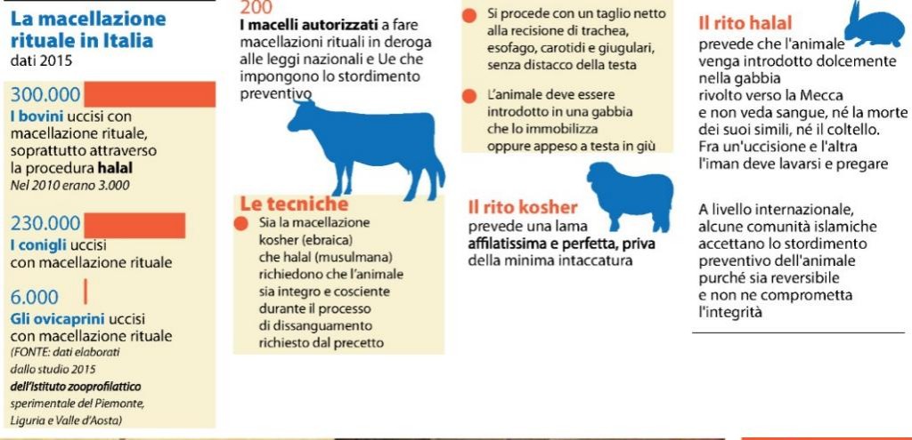 «Non c’è tangibile differenza sul sopraggiungere dell’insensibilità» affermano dalla Comunità ebraica di Roma. Secondo uno studio Efsa (Autorità europea per la sicurezza alimentare), però, da quando un ovino kosher viene appeso, fino al primo affondo di lama, trascorrono quasi quattro minuti, mentre la iugulazione halal dei bovini impone 25 movimenti di coltello. «Sul 93% del campione il riflesso corneale cessava 80 secondi dopo l’ultimo taglio» dice Maria Caramelli, direttore generale dell’IZS del Piemonte, Liguria e Valle d’Aosta, che a sua volta ha condotto uno studio. Solo in Piemonte ogni anno vengono uccisi, perlopiù con procedura halal, 30.000 bovini, 23.000 conigli e 600 ovicaprini. «In otto dei venti stabilimenti esaminati la comunità islamica ha accolto lo stordimento preventivo, elettrico, o con pistola non penetrante, così che l’animale possa reputarsi integro».
