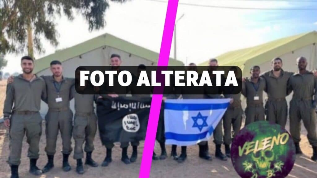 Circola un’immagine in cui si vedono dei soldati che mostrano la bandiera israeliana a fianco a quella dell’Isis. La foto è stata alterata. Nell’originale la bandiera dell’Isis è quella della Brigata Golani, un’unità dell’esercito d’Israele. La foto risale a giugno 2023, in occasione della partecipazione di alcuni soldati Israeliani a un’importante esercitazione militare in Marocco.