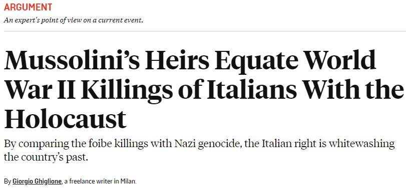 Efforts to equate the foibe with the Holocaust conveniently transforms Italy from a perpetrator into a victim. Historical truth will be the primary casualty, and distorting it has become a propaganda tool to whitewash the country’s past and legitimize the current Italian right, which still claims some connection to the fascist regime without fully embracing it.