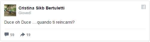 Il sindaco di Gazzada Schianno, cinquemila abitanti alle porte di Varese, ha rivelato su Facebook di avere delle simpatie per Mussolini. «Duce oh Duce… quando ti reincarni?». Con queste parole nella bacheca pubblica di Facebook Cristina Bertuletti ha raccolto una sessantina di consensi tra amici e conoscenti. In un altro commento ha scritto di desiderarlo «Grasso , grosso e più cattivo che mai!». E ancora: «Io sono leghista e ripudio tutto ciò che accomuna gli italioti, specie se rossi. E pure rosé». Infine ha chiuso così: «Il Duce, oggi, sarebbe più che leghista. Direi integralista». In un altro commento la settimana scorsa aveva affermato di augurarsi la pena di morte nei confronti di Annamaria Furlan, segretario generale della Cisl. I vertici locali dei sindacati avevano protestato duramente. Bertuletti non è nuova a iniziative singolari. Nel 2010 convocò un consiglio comunale in maschera, l’anno seguente cambiò il nome di una strada per intitolarla a Gianfranco Miglio.