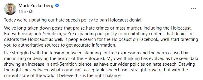 Facebook aggiorna le sue policy sull’incitamento all’odio per vietare qualsiasi contenuto che neghi o distorca l’Olocausto. Lo annuncia la stessa società spiegando che è «un altro passo nell’impegno per combattere l’odio nei servizi». «Se le persone cercano l’Olocausto su Facebook inizieremo a indirizzarti a fonti autorevoli per ottenere informazioni accurate — sottolinea Mark Zuckerberg —. Sono stato combattuto tra la libertà di espressione e il danno causato dal minimizzare o negare l’orrore dell’Olocausto». La scelta di Facebook di rimuovere questi contenuti è un cambio di rotta rispetto al 2018 quando la piattaforma, pur ammettendo che la negazione dell’Olocausto «è profondamente offensiva», aveva sostenuto la libertà di espressione scatenando una bufera, tanto che Zuckerberg aveva chiarito le sue parole precisando di non voler difendere le persone che lo negano. «Il mio pensiero si è evoluto — dice ora Zuckerberg — quando ho visto i dati che mostrano un aumento della violenza antisemita». «Ritengo che la questione del negazionismo sia un ballon d’essai. Con questo provvedimento si attribuisce agli algoritmi la potestà di discriminare, uso parole di Zuckerberg, quale sia un discorso accettabile e quale no», attacca l’avvocato Lorenzo Borrè, animatore di battaglie giudiziarie per le liberta civili e legale di molti espulsi dal M5S. «Domani un algoritmo potrà decidere quale sia una opinione accettabile»