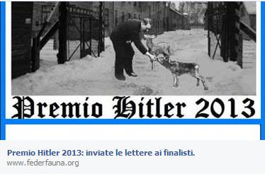 Nel novembre di un anno fa, quando il premio fu annunciato per la prima volta, l’Anpi bolognese era insorta, parlando di “una provocazione abberrante”: Hitler era un fervente animalista e vegetariano, ma è anche il primo responsabile di milioni di morti. “Dove sta l’ironia del messaggio?”, si chiedeva il numero uno dei partigiani bolognesi, William Michelini. In effetti, ce lo chiediamo anche noi. Link alla lettera di Federfauna http://www.federfauna.org/newss.php?id=8559