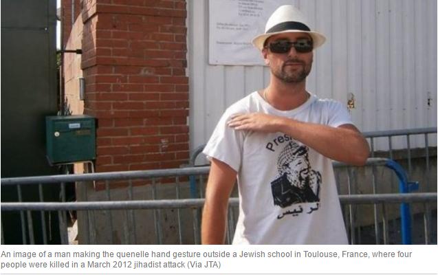 The quenelle is promoted by the anti-Semitic comedian Dieudonne M’bala M’bala, whose critics say it is a variant of the Nazi salute designed to express admiration for the murder of Jews without incurring the punishment reserved in the French penal code for doing so.