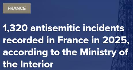 1,320 antisemitic incidents recorded in France in 2025, according to the Ministry of the Interior
