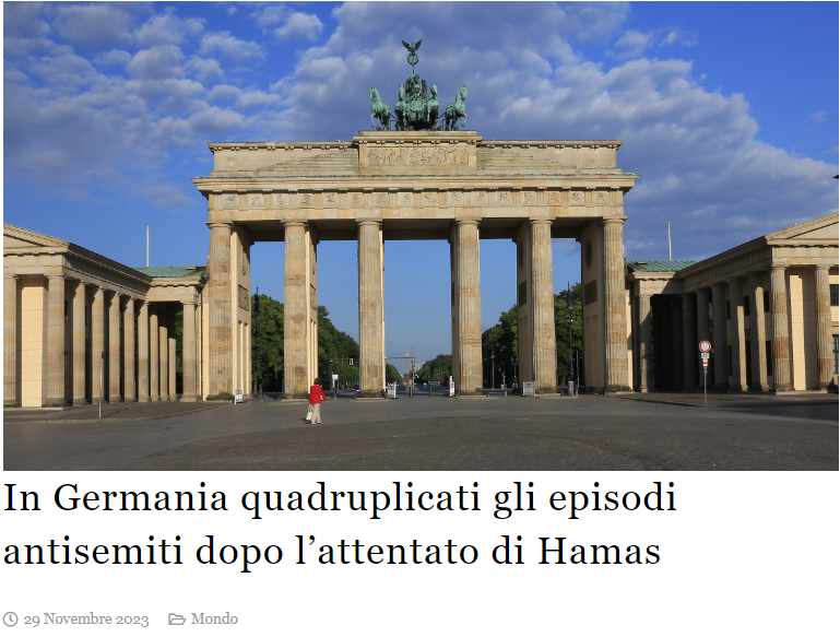 In seguito al terribile pogrom del 7 ottobre 2023 in Israele, da parte del gruppo terroristico Hamas, in Germania si sono registrati almeno 29 episodi antisemiti al giorno, un aumento quattro volte superiore rispetto al 2022. Martedì il RIAS, organizzazione finanziata dal Governo tedesco che si occupa del monitoraggio di incidenti a sfondo antisemita, dopo l’occupazione del 7 ottobre dei gazawi in Israele in cui hanno seminato morte e terrore, ha riportato un totale di 994 incidenti antisemiti.