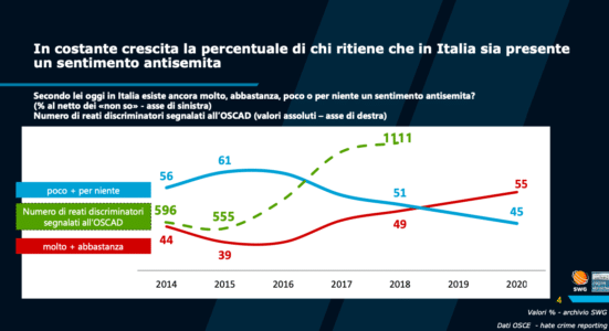Uno scatto nel segno non tanto dell’emotività quanto di una reale consapevolezza delle molte minacce alla stabilità sociale che pure la condizione di crisi legata all’epidemia finisce per incentivare. Un numero tra gli altri spicca. Se nel 2015 a dirsi molto o abbastanza preoccupato per l’antisemitismo era infatti il 39% degli italiani, oggi sono 55 su 100 a scegliere questa opzione (nel 2020 erano stati 52). Un dato che non è certo casuale ai fini di questo rafforzamento.