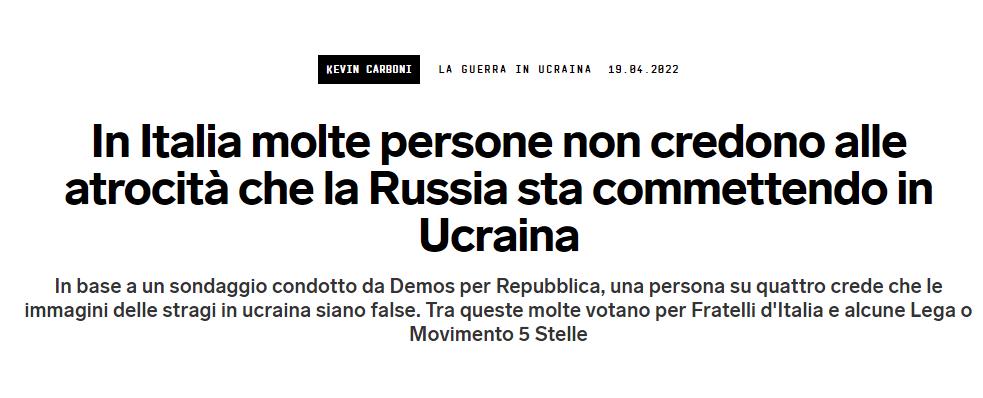 In base a un sondaggio condotto da Demos per Repubblica, una persona su quattro crede che le immagini delle stragi in ucraina siano false. Tra queste molte votano per Fratelli d’Italia e alcune Lega o Movimento 5 Stelle