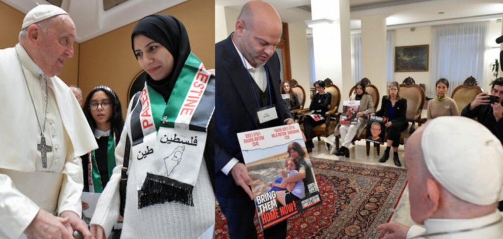 Che l’incontro di ieri non fosse andato per il verso giusto si era capito anche quando la Santa Sede si è trovata a dover smentire il fatto che Francesco avesse usato il termine genocidio per descrivere la guerra a Gaza. A Santa Marta il pontefice ha visto dodici parenti di ostaggi israeliani detenuti da Hamas, poi nell’Auletta Paolo VI dieci palestinesi con “parenti prigionieri di Israele”, una definizione quella del Papa che ha scatenato accese contestazioni nel mondo ebraico. Una ventina di minuti per ciascuno dei gruppi per sottolineare che “il popolo palestinese, il popolo di Israele, hanno il diritto alla pace, hanno il diritto di vivere in pace”, sono “due popoli fratelli”, come dirà in un video-appello per la pace in tutte le lingue, compreso l’arabo e l’ebraico.
