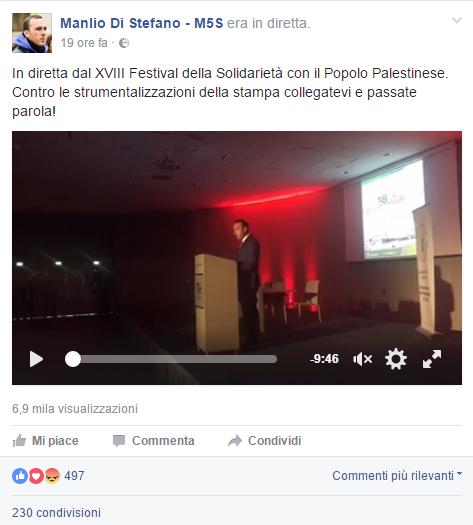 Oltre centocinquanta commenti sulla sua pagina Facebook, spesso in tono polemico. L’intervento del deputato Cinque Stelle, Manlio Di Stefano, al XVIII Festival della solidarietà con il popolo palestinese ieri a Milano, ad Assago presso l’hotel Nh, non è passato inosservato alla base . Il deputato è finito nel mirino dei contestatori proprio per il taglio filopalestinese dell’ evento. E per la presenza — in diversi eventi legati al Festival — di figure controverse, alcune indicate come vicine ad ambienti radicali. Con Di Stefano hanno preso parte alla manifestazione anche i parlamentari di Mdp Arturo Scotto e Giovanna Martelli. Il Festival è stato organizzato dall’Associazione dei palestinesi in Italia in collaborazione con l’Associazione benefica di solidarietà con il popolo palestinese. Promotore della kermesse Mohammad Hannoun, che sulla sua pagina Facebook nei giorni scorsi scriveva di Israele come «un’entità fondata sui massacri contro il popolo palestinese». Tra gli invitati a Milano anche Mohammad Moussa Al Sharif, teologo islamico saudita che in passato si è scagliato contro «cristiani, atei e fornicatori». Dal palco il cinquestelle Di Stefano ha detto: «Sento di fare un appello ad ambo le parti (Israele e Palestina, ndr): i confini del ’67 devono essere un punto fermo per tutti». E. Bu