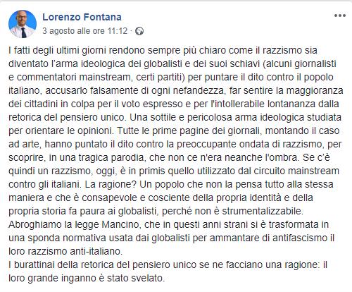 “Abroghiamo la legge Mancino, che in questi anni strani si è trasformata in una sponda normativa usata dai globalisti per ammantare di antifascismo il loro razzismo anti-italiano“. La proposta è del ministro della Famiglia, Lorenzo Fontana: “I burattinai della retorica del pensiero unico se ne facciano una ragione: il loro grande inganno è stato svelato”, aggiunge l’esponente della Lega, bocciando con vigore la tesi secondo cui in Italia vi sarebbe un’emergenza razzista.