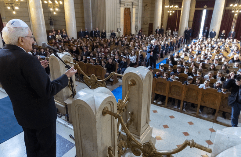 “Lechaim” e “Shabbat Shalom”. L’augurio per la vita e l’espressione con cui si dà il benvenuto al Sabato, il giorno più importante della settimana ebraica. Sergio Mattarella parla a braccio, il volto che si concede più di un sorriso, conquistando la platea di giovani e giovanissimi che gremisce la sinagoga. Nel giorno della visita alla Comunità ebraica di Roma, una nuova occasione per lanciare un messaggio di consapevolezza a tutta la società italiana.