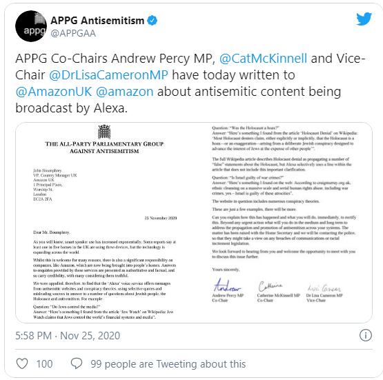 The leadership of the All-Party Parliamentary Group Against Antisemitism has written to Amazon UK’s Vice President to alert him to Alexa’s propensity to answer antisemitic questions by directing users to websites “using selective quotes and misleading sources” and without providing any context.