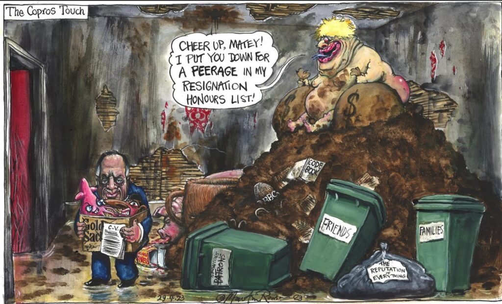 Mr Rowson has since apologised for the cartoon, stating: “Satirists, even though largely licenced to speak the unspeakable in liberal democracies, are no more immune to f***ing things up than anyone else, which is what I did here…I know Richard Sharp is Jewish; actually, while we’re collecting networks of cronyism, I was at school with him, though I doubt he remembers me. His Jewishness never crossed my mind as I drew him as it’s wholly irrelevant to the story or his actions, and it played no conscious role in how I twisted his features according to the standard cartooning playbook.”