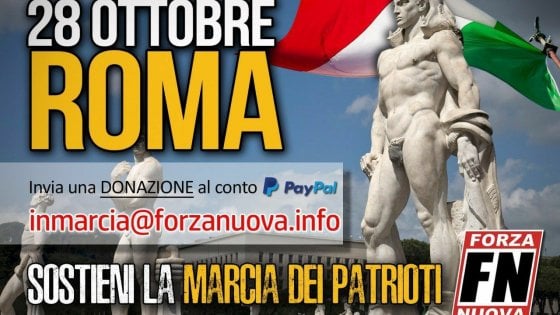 MILANO. La data è tutto un programma: 28 ottobre. Lo stesso giorno del 1922, 25mila camicie nere del Partito nazionale fascista (PNF) entrarono nella capitale e la manifestazione armata permise a Benito Mussolini di prendere il potere con la forza: iniziò così il ventennio fascista in Italia. Novantacinque anni dopo, un partito neofascista, anzi, “nazifascista”, come ha già sentenziato due volte la Cassazione, Forza Nuova, riproporrà la fatidica e tristemente nota “marcia su Roma”. Sempre il 28 ottobre. Cambia solo il nome. Si chiamerà “marcia dei patrioti”. L’evento è stato lanciato sulla pagina Facebook della formazione di estrema destra: “28 ottobre in marcia”, è il titolo del post pubblicato il 3 settembre. “Bandiere, striscioni, auto, pullman, benzina… Compatriota, la macchina organizzativa è in moto ed ha bisogno del tuo sostegno concreto”, recita la chiamata. “Il 28 ottobre Roma ospiterà la grande marcia forzanovista contro un governo illegittimo, per dire definitivamente no allo ius soli e per fermare violenze e stupri da parte degli immigrati che hanno preso d’assalto la nostra Patria”. Segue richiesta di sostegno. “Contribuisci alla marcia con una donazione all’indirizzo PayPal inmarcia@forzanuova.info”. L’annuncio dell’iniziativa ha prodotto su fb una lunga striscia di adesioni e commenti entusiastici da parte di camerati da tutta Italia: centinaia di “presente!”, “ci siamo”, “Milano ci sarà”, “Rieti presente”, “Catania presente”. E ancora nostalgismi tipo “marciare per non morire”, “sempre fino alla morte”, “siamo fiaccole di vita siamo l’eterna gioventù che conquista l’avvenir…”. Negli ambienti del partito di Roberto Fiore, al momento, c’è riserbo sulle modalità e i dettagli della “marcia dei patrioti”: il fatto che sia stata comunicata sui social fa supporre che i dirigenti forzanovisti abbiano chiesto ed evidentemente ottenuto un’autorizzazione, almeno di massima, da parte di questura e prefettura. Nei prossimi giorni si saprà qualcosa di più preciso. Sarà interessante capire, per esempio, se davvero – vista la dichiarata e provocatoria scelta “rievocativa” del 28 ottobre, per ricalcare la marcia del PNF – andrà in scena appunto un corteo o una manifestazione statica. Prima ancora che ragioni di opportunità, ci sono di mezzo – è evidente – le leggi Scelba e Mancino. Ma tant’è: dopo gli attacchi contro lo ius soli (scontri con la polizia sotto il Senato il 15 giugno scorso: 64 denunciati ), Forza Nuova continua a alzare il tiro. Gli ultimi casi – denunciati da “Repubblica” – sono di questi giorni: il manifesto sui migranti stupratori ispirato alla Rsi, e le ronde con pugili e ultras.