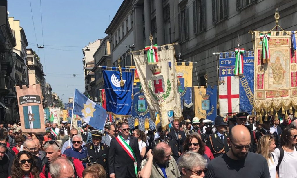 (Nell’immagine: i gonfaloni di UCEI e Brigata Ebraica durante un corteo del 25 Aprile a Milano)