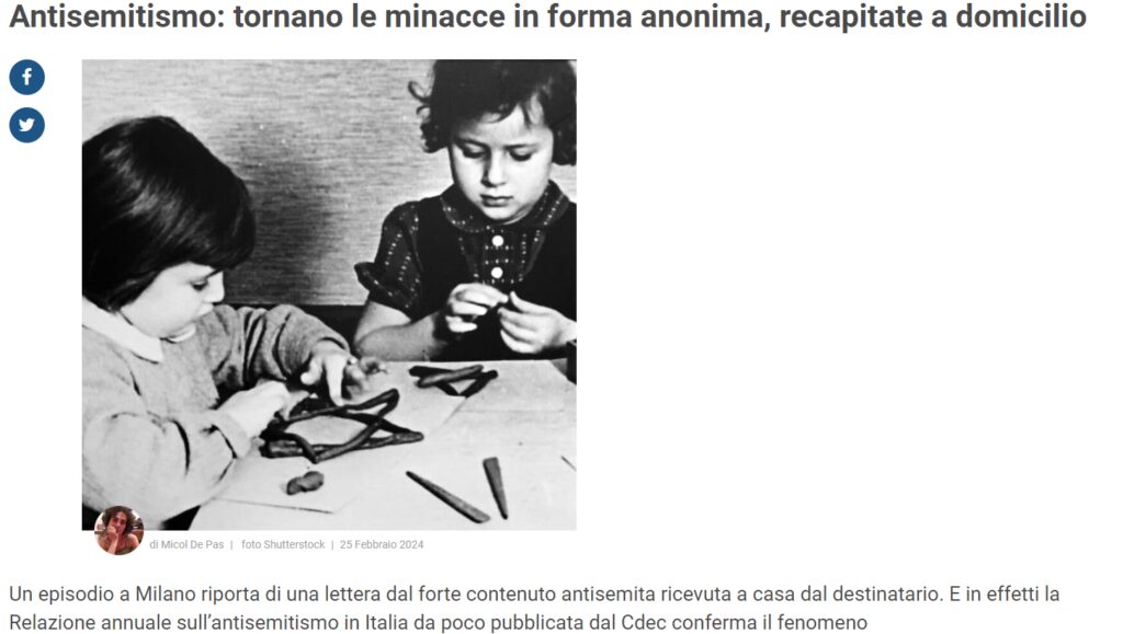Un episodio a Milano riporta di una lettera dal forte contenuto antisemita ricevuta a casa dal destinatario. E in effetti la Relazione annuale sull’antisemitismo in Italia da poco pubblicata dal Cdec conferma il fenomeno