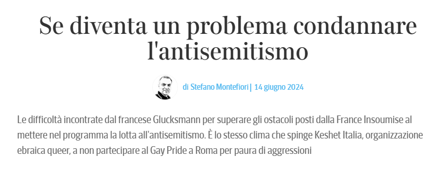 Le difficoltà incontrate dal francese Glucksmann per superare gli ostacoli posti dalla France Insoumise al mettere nel programma la lotta all’antisemitismo. È lo stesso clima che spinge Keshet Italia, organizzazione ebraica queer, a non partecipare al Gay Pride a Roma per paura di aggressioni
