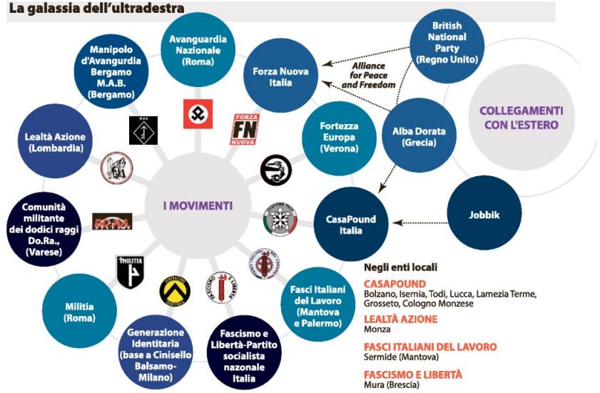 «Spero che tutte le figlie di chi elogia l’integrazione vengano brutalmente stuprate dentro una fredda stazione da qualche allogeno» (di altra stirpe o nazione, ndr ). Lo scrive il 1 giugno su Fb il responsabile romano di Forza Nuova, Alessio Costantini. Già inquisito per le ronde punitive contro i lavoratori bengalesi pestati in strada all’Appio Latino ( “Bangla-tour”, indagine dei carabinieri del Ros), il caporione chiama a raccolta i camerati contro lo Ius soli. Scrive ancora: «Mentre il fumo delle vostre lacrime si dissolverà in questo inferno, noi staremo in trincea a difendere questo brandello di identità che ci unisce per l’eternità». Settantatre anni dopo la fine del nazifascismo sta montando in Italia – antifascista per Costituzione – un’onda nera che afferma la sua voglia di protagonismo. Che occupa spazi e entra nei consigli comunali (eleggendo rappresentanti oppure con blitz squadristi tipo quelli di CPI a Catania e Milano dove il sindaco Beppe Sala è ora sotto protezione per minacce ricevute ). Che aspira a mettere le mani sulle leve della politica che decide. E’ una nuova ultradestra antidemocratica, attrattiva per i giovani, abile nel cavalcare il disagio sociale diffuso, soprattutto nelle fasce deboli, nelle periferie. Da Nord a Sud propone un’offerta non più metapolitica: welfare “socialista” e provocazioni, sul web, nelle piazze, nei circoli, allo stadio, e spazi comunali, spiagge ( il caso Chioggia denunciato da “Repubblica” finito in Procura e in Parlamento; le ronde antiambulanti di CPI a Ostia ). In mezzo al mare, con la nave anti-Ong di Generazione Identitaria fermata a Cipro. Persino negli oratori e nei cimiteri. E nei municipi, dove consiglieri, assessori e sindaci escono allo scoperto: indossano felpe coi simboli di unità militari naziste (Andrea Bonazza, capogruppo CPI a Bolzano), si augurano che «ritorni il fascismo in questo Stato di merda» ( Andrea Bianchi, sindaco di Tremano). Il modello di riferimento? I greci di Alba Dorata. Lotta ad alzo zero ( anche fisica) contro le minoranze etniche e culturali, mutualismo “buono” con raccolta fondi e distribuzioni di generi di necessità ( “l’Italia agli italiani” ). Un frullato di propaganda. «Sembriamo la Grecia – ragiona il sociologo Aldo Bonomi -. Nelle periferie c’è la guerra tra gli ultimi (gli immigrati stranieri) e i penultimi (la popolazione locale). C’è chi si mette in mezzo per cercare di unire, e chi per dividere. Alba Dorata ha diviso e poi ha iniziato a occuparsi del disagio dei penultimi. In Italia finché la sinistra non metterà in campo politiche serie su povertà e esclusione, i gruppi neofascisti continueranno a crescere».