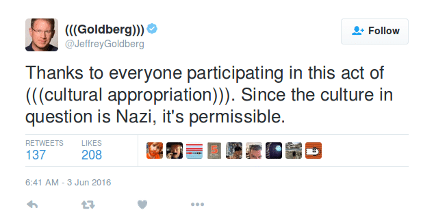 Uno sviluppatore anonimo, nel frattempo, ha creato “Echo Location”, un sistema che sfruttando le API di twitter permette di ricercare e quindi raccogliere tutti i tweet in cui compare il simbolo ((( ))). Piccolo problema: Ora, però, uno sviluppatore anonimo ha messo a disposizione un sistema che permette di visualizzare in un unico posto tutti i tweet che lo contengono, rendendo così facilmente individuabili gli autori delle aggressioni online. Nell’elenco che si ricava, però, vengono inclusi anche coloro che hanno aggiunto l’eco al proprio nome. Non sono pochi: l’idea di distruggere il simbolo antisemita semplicemente appropriandosene è partita da alcuni giornalisti ebrei – fra i primi Jeffrey Golberg (giornalista di The Alantic) e Yair Rosenberg, del Tablet – e molti non ebrei ne hanno seguito l’esempio aggiungendo le parentesi al proprio nome per confondere gli antisemiti, in esplicita solidarietà con le vittime delle aggressioni. Le parentesi così da strumento di derisione si sono trasformano in uno scudo, in una fascia di protezione e sostegno, trasversale e condivisa.